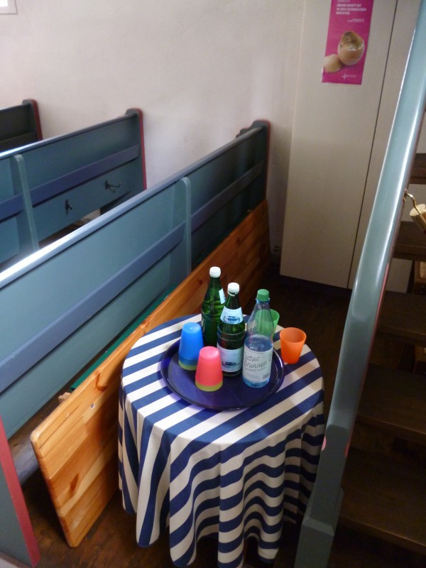 In der Kirche von Kirchhosbach finden wir eine kleine Erfrischung vor. Das ist wirklich eine tolle Geste. Wir nehmen das Angebot dankend an. Über dem Altarraum der Kirche steht „Kommt her zu mir, alle, die ihr mühselig und beladen seid; ich will euch erquicken.“ Matthäus 11,28. Der Spruch ist Programm und passt exakt 🙂