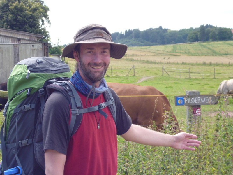 Kurz vor Homberg (Efze) treffen wir noch auf einen Pilger, der sich in umgekehrter Richtung von Marburg nach Eisenach auf den Weg gemacht hat. Er erzählt uns, dass er den Weg bereits mit dem Fahrrad gemacht hatte und nun die Schönheit des Weges zu Fuß erkunden möchte. Mir fiel dazu gleich das Buch „ich bin da noch mal hin“ von Anne Butterfield ein. Er läuft die Umgekehrte Richtung weil er so hofft mit mehreren Pilgern zusammen zu treffen. Da er uns getroffen hat, scheint das ja auf zu gehen. In Homberg (Efze) hat er das Freibad kurz zuvor besucht und meinte uns könnte diese Abkühlung ebenfalls gut bekommen. Ich überlege noch kurz aber Jana hat schon das „white line fever“ und ich kann es gut verstehen.