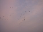 November 2011. We drove together with friends of us to a dried dam lake to observe the cranes. It was cold and the fog lay over the landscape like a heavy blanket. Looks mysterious. Only in the far distance you can hear the call of the cranes who stopped here on their way south. Then like a signal, the cranes rises and one group after another start their journey to the south. Breathtaking and mysterious at same.